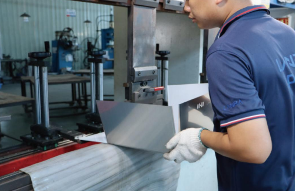 각 판재를 수작업으로 정렬하고, 모서리 부위를 TIG 또는 MIG 용접으로 정밀하게 접합합니다.